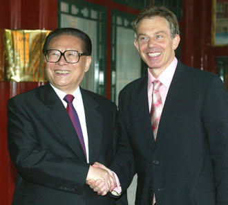 Earlier, Jiang Zemin, chairman of the Central Military Commission (CMC) of China, met with Blair, expressing his welcome to the British Prime Minister.