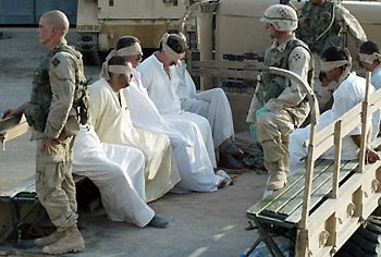 Blindfolded Iraqi detainees sit in a military truck in a U.S. army base in Tikrit, about 110 miles (180 km) northwest of Baghdad, Iraq, Tuesday Aug. 12, 2003. [AP]
