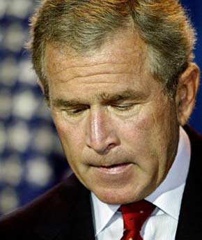 U.S. President Bush pauses for a moment as he condemns the deadly bombing of a Baghdad hotel housing the United Nations' headquarters in Iraq, speaking from his ranch near Crawford, Texas, Tuesday, August 19, 2003. Bush called it the act of murderers who are enemies of the civilized world. [AP]