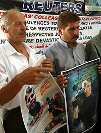 Palestinians hold portraits of Reuters cameraman Mazen Dana during a commemoration inside his family house in the West Bank city of Hebron, August 19, 2003. International media rights bodies called on the United States to launch a full inquiry into the killing of award-winning Dana, who was shot dead by U.S. troops in Iraq.  [Reuters]