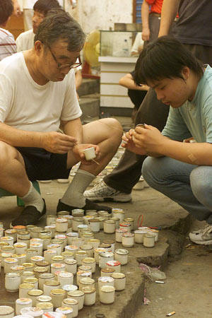 It was clearly beyond the Briton's comprehension that there are even more expensive crickets. At the Flower and Bird Market on Xizang Nanlu in downtown Shanghai, several traders boast of selling a single cricket for 10,000 yuan (US$1,210) or more. Raising crickets is a traditional Chinese hobby. According to historical records from the Tang Dynasty (AD 618-907), imperial concubines put crickets in small gold cages and took them to bed to hear their singing during the night. Ordinary people later followed what they considered a graceful hobby. The activity was still flourishing during the Qing Dynasty (1644-1911), when the imperial family, city residents, village people and scholars all feverishly collected crickets every summer. The tradition was passed on. "I have hundreds of cricket jars and I keep them in my bedroom and living room. I enjoy them so much on summer days," said 28-year-old Fu Cun. Fu isn't the only one addicted to raising these fascinating insects, which can both sing and fight. It is estimated by www.xishuai.net, a national cricket website, that there are about 10 million people raising crickets from July to November each year, when the insects reach maturity. In Shanghai alone there are 20 cricket markets, and many other Chinese cities, including Beijing, Hangzhou, Xi'an and Nanjing have at least one each. Great popularity No one knows exactly why this small insect has struck such a chord with the Chinese people, but poems, essays and even learned research about crickets have been passed down from antiquity. A big body, big jaws and a black face are the standard of excellence for a cricket, but finding a good one is not easy. Fu Cun, who has been involved with cricket fighting for 20 years, said he often has to wait in the field for a whole day before he finds the right one. "It will be very lucky that I can find one good specimen in a day," he said. The way a cricket is raised is also crucial. "I feed my crickets a special combination of corn and wheat flour with sliced apple," said Huang Huoyong, a stall keeper at the Xizang Nanlu Flower and Bird Market. For especially excellent crickets, calcium tablets or ginseng might be added to strengthen their bodies and hone their fighting abilities. Huang said that among cricket fighting's most devoted fans it is common to hear they would rather share their bed with their crickets than their wives. Others, like Huang, simply enjoy the insects' beautiful singing. He recorded a CD of cricket and bird singing and says: "When I am tired, I just enjoy this CD and feel relaxed." But for most cricket hobbyists, fighting is the supreme goal. "It gives me a great sense of victory and happiness when my cricket wins," Fu said. Solitary creature