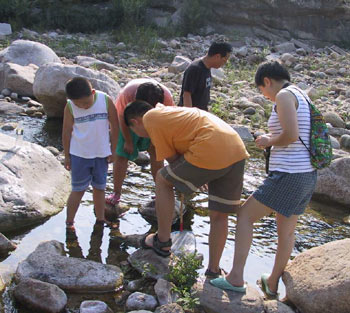 After lunch Zhao asked his daughter Zhao Rongjie, 10, to guide us to the river by the village. He suggested we go to the mountains the next morning. I later learned that the stream was where Zhao got those small fish. Honestly speaking, the girl was not a very good guide, but she had a great talent for catching fish and frogs. Setting them free was another way she amused the guests. When it was getting dark, we returned. Before supper I volunteered to follow Granny Zhao to pick corn in the fields. It was interesting to see that the limited space of about 130 square metres by the roadside was divided into several plots growing corn, maize, sweet potatoes, egg plants, tomatoes and beans - more than 10 different crops in all. Granny Zhao, in her 70s, jumped into the cornfield in search of large cobs. After getting 16 pieces, the elderly woman and her little grandson carried the bag home, where they sat in front of the house and stripped the corn. "It tastes sweet," the old woman said. "I'll use the big wok to cook with wood so it gets its full flavour." She was right. The corn tasted really sweet and fresh, and had a delicious smell. It was neither too hard nor too tender. I took two large cobs, but could eat no more because I had to save room for the baked rainbow trout, fresh from the spring. With another plate of wild plant salad and a dish of sauteed newly-picked huzi, a cucumber-like vegetable, I was full. After such a big meal I felt I must do some exercises, so I went for a stroll around the village.The stars twinkling in the sky looked brighter and larger than what I saw in the city, and the shadows of the distant Baiquan Mountains looked lofty and scary in the moonlight. That night it was hard for me to fall asleep. One reason was that I had too much to eat, but also the kang was too hard and made my back ache. I turned from left to right, trying to find a comfortable position. I kept telling myself next time I'll choose the room with sofa beds.