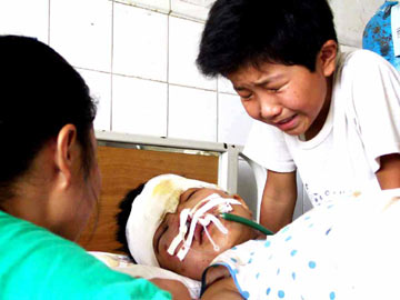 Duoduo (centre), 11 years old, lies in bed as her mother (left) and younger sister weep in a hospital in Pingdingshan, Central China's Henan Province. Duoduo was saved after trying to commit suicide by jumping from the sixth floor of a building. [newsphoto.com.cn]