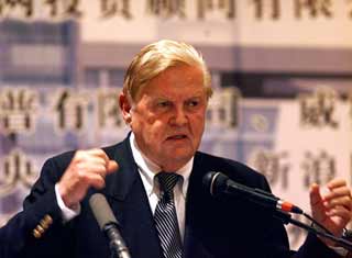 Robert Mundell, a 1999 Nobel laureate in economics, defends China's position of not appreciating renminbi while speaking to a forum at the Sixth Beijing International High-tech Expo. [newsphoto.com.cn]