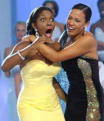 Dunlap wins a rhinestone tiara, a runway walk, US$50,000 in scholarship aid, a yearlong national speaking tour and -- after it -- the permanent tag of "former Miss America." Miss Hawaii Kanoelani Gibson was first runnerup and Miss Wisconsin Tina Sauerhammer was second runnerup. Miss Maryland Marina Harrison and Miss California Nicole Lamarche rounded out the final five. When her name was announced, Dunlap gasped, held her hands to her face and exclaimed "Oh, my God" several times. Dunlap won both the evening gown and the talent portion of the competition, singing "If I Could." She correctly answered five of eight questions on a pop quiz given to the five finalists. A student at the University of Central Florida, Dunlap plans to promote cultural diversity during her yearlong reign as Miss America. The daughter of a roofing contractor and a nurse, Dunlap aspires to go to law school when she graduates and become an attorney specializing in sports and entertainment. Dunlap was crowned by Miss America 2003 Erika Harold, 23, of Urbana, Illinois, who won the title last year after delaying her entry to Harvard Law School. Dunlap defeated other rivals with impressive academic credentials. Sauerhammer is already an M.D. at age 22; Miss Virginia Nancy Redd and Miss Rhode Island Laurie Gray, are both recent Harvard University graduates; and Miss New Mexico Rana Jones, is a second-year law student. Other contestants included Miss Iowa Nicole White, a certified forklift operator, and Miss New York Jessica Lynch, who's no relation to the U.S. Army private captured in Iraq. While contestants were focusing on their competition, pageant organizers were busy trying to spice up the telecast, which has hemorrhaged viewers in recent years. This year's pageant included -- for the first time -- a casual wear competition, in which contestants were asked to wear what they would socialize in. The age-old swimsuit competition, meanwhile, saw the contestants wearing sarongs over their bikini bottoms. In another twist, pageant viewers were kept informed of who was winning by the show's announcers, who couldn't be heard by the judges or contestants in Boardwalk Hall. Last year, about 12 million people watched the crowning of Harold, an all-time low. Among the wrinkles this time around: a "viewing party" hosted by Trista Rehn and Ryan Sutter of the ABC reality show "The Bachelorette" and a live performance by "American Idol" runner-up Clay Aiken.