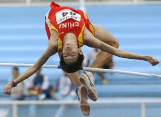 Wang Zhouzhou of China competes in the High Jump men's finals on the last day of the 15th Asian Athletics Championships in Manila September 23, 2003. Wang jumped 2.23 metres to win the competition. [Reuters]