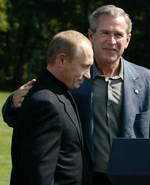 U.S. President George W. Bush pats his Russian counterpart Vladimir Putin on the back after remarks to the press at the Camp David Presidential retreat in Maryland September 27, 2003. Bush and Putin urged Iran on Saturday to cooperate with international demands to insure it is not developing a nuclear weapon. [Reuters]