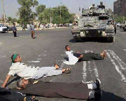 Shi'ite Muslim protesters lie down in front of a U.S. Army Bradley vehicle October 8, 2003 after hundreds marched to the Baghdad headquarters of the U.S.-led administration in Iraq. [Reuters]