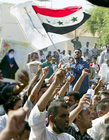 A Shi'ite Muslim protester waves an Iraqi flag October 8, 2003 after thousands marched to the Baghdad headquarters of the U.S. led administration in Iraq. More than 2,000 Shi'ite Muslims marched to the headquarters of the U.S.-led administration in a second day of protests demanding the release of a cleric arrested by American troops. [Reuters]