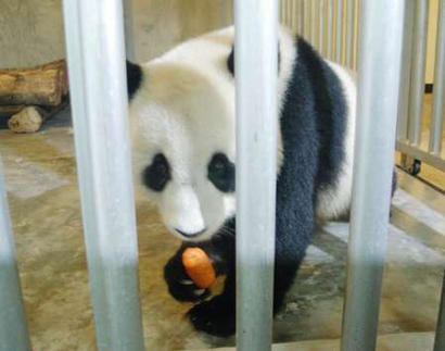 | | Lin Hui, a two-year-old female panda, eats carrot inside its new home at Chiang Mai Zoo, in northern Thailand, October 12, 2003. Lin Hui and three-year-old male panda Chuang Chuang were presented to the Thai government by China and will act as 'animal ambassadors' to reflect the close relationship between the two countries. The Thai government have spent 40 million baht ($1 million) on specially built air-conditioned enclosures and a recreational area for the pandas from China's Cheng Du city. [Reuters] |