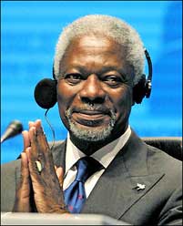U.N. Secretary-General Kofi Annan gestures at the start of the Iraq Donors' Conference in Madrid. [AP]