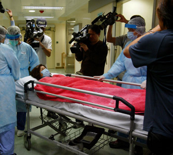 A healthcare worker is wheeled past the media during a SARS (severe acute respiratory syndrome) drill October 30, at Princess Margaret Hospital in Hong Kong. The hospital is the first one in the territory to allocate 50 beds for the isolation of SARS patients. [newsphoto.com.cn]