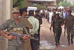 Sri Lankan army soldiers patrol on the streets of Colombo, Sri Lanka, Tuesday, Nov.4, 2003. Sri Lankas government was plunged into crisis and its peace process dealt a severe blow when the president fired the defense minister, interior minister and media minister, who have been working to coax Tamil rebels back into talks to end a 20 years civil war.  [AP]