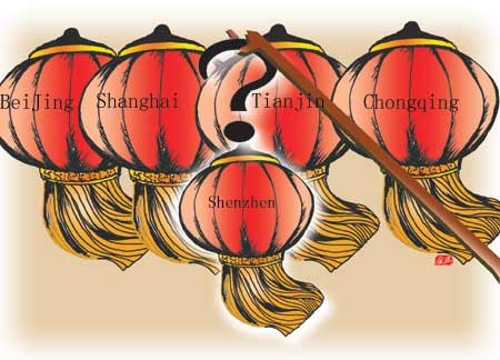 Shenzhen, another municipality? ( 2003-11-07 10:06) (China Daily HK Edition) If Shenzhen were to become a municipality under the direct supervision of the central government, it would be the fifth city granted such status, after Beijing, Shanghai, Tianjin and Chongqing. Those who keep a close eye on the city's evolution are hotly debating the wisdom of such a move. However, an official with the municipal government recently issued a flat denial: "The city government has never expressed something of this nature. What we are concerned with is greater innovation within the system."