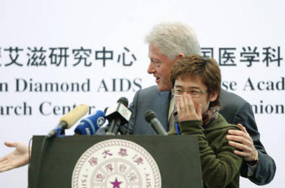 Bill Clinton (L) talks with Song Pengfei, a 21-year-old AIDS(Acquired