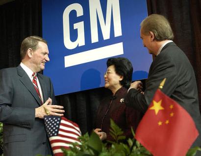 General Motors Chairman & CEO Rick Wagoner, left, and (C) and GM Vice President of North America Gary Cowger, flank Chinese vice minister of commerce Ma Xiuhong at GM's World Headquarters at Detroit's Renaissance Center, Wednesday, November 12, 2003, after an agreement was signed. The agreement makes GM China the first China-based subsidiary of a non-donestic automotive company to sign such a vehicle import contract. [AP]