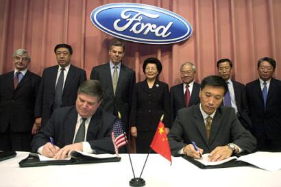 David Schoch, Finance Director, Asia Pacific Operations, Ford Motor Company, seated left, and Alvin Liu, Director of Government Relations, Ford China, seated right, sign trade pacts in Dearborn, Mich., Wednesday, Nov. 12, 2003 as Mark Schulz, Ford Motor Co., Group Vice President, Asia Pacific, rear center left, and Chinese vice minister of commerce Ma Xiuhong, rear center right, look on.
