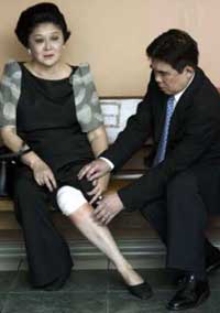 Former Philippine first lady Imelda Marcos (L), with the help of her private doctor Roberto Anastacio, shows her bandaged swollen left knee after she appeared in an anti-graft court in Manila Nov. 13, 2003. [Reuters]