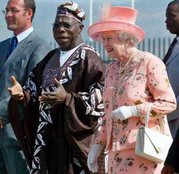 Britain's Queen Elizabeth II (R) walks with Nigeria's President Olusegun Obasanjo (L) at the Millennium Park in Abuja, Nigeria, December 4, 2003. The queen, on her first state visit to Nigeria for 47 years, is due to open a four-day summit of Commonwealth leaders on Friday.   [Reuters]