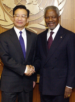 Tensions have risen across the Taiwan strait since last month, when the island's "parliament" passed a law allowing referendums. Taiwan "President" Chen Shui-bian has backed off an independence vote but instead planned a referendum in March asking Beijing to withdraw ballistic missiles aimed at the island. Asked about the March referendum, Wen said China understood "the aspiration of the people in Taiwan for democracy." "However, the essence of the problem now is that the separatist forces within the Taiwan authorities attempt to use democracy only as a cover to split Taiwan away from China and this is what we will never tolerate." But he said that as long "as there is still a glimmer of hope, the Chinese government will not give up its efforts for a peaceful unification and a peaceful settlement." "We believe this will serve the interest of both sides of the Taiwan Straits. This will also be conducive to peace and stability in Asia Pacific and the world at large," the premier said. The Chinese government has always adhered to the principle of "peaceful reunification, one country, two systems," believing that this is the most important principle for the settlement of the Taiwan issue, Wen said. The Chinese premier added that he and Annan discussed, among other things, the nuclear issue of the Democratic People's Republic of Korea (DPRK), UN reforms, the relations between China and the world body, the global fight against poverty and AIDS and the economic development in Africa. "We see completely eye to eye on these issues," Wen said, while promising to strengthen the cooperation between China and the United Nations. On his part, Annan, standing beside Wen, reiterated the adherence to the one-China policy by the United Nations. "We have the one-China policy, and also our support for the approach that all the differences will be settled politically and peacefully, without any resort to any violence. So we maintain the one-China policy and the need to resolve all issues peacefully," he said. Annan expressed his thanks for China's economic and material support for the economic development of African countries. Premier hopes for closer China-US relations Premier Wen Jiabao, at a meeting here with American scholars Sunday night, stressed that China and the United States should avoid conflicts and make more efforts to deepen their relations. A review of the history of China-US relations over the past half century leads to a basic conclusion that both gain from peaceful coexistence and lose from conflicts, and it is a common understanding that the two nations should continuously broaden and deepen their relations, Wen said. Wen discussed with these American scholars China-US economic and trade ties, the exchange rate of the Chinese currency, the RMB, and relations across the Taiwan Straits. Wen said that China will make joint efforts with the United States to establish a new mechanism of consultation to properly handle possible friction and conflicts and start a new phase of cooperation in economic relations and trade between the two sides. Among the scholars were David Lampton, director of Chinese Studies, Johns Hopkins School of Advanced International Studies, and Richard Haass, president of the Council on Foreign Relations. They noted that the China-US relations have improved a great deal amid ups and downs over the past three decades as both sides managed to narrow their differences and open up broad prospects for further cooperation. They cautioned that the two countries should work together to properly handle the problems in bilateral trade. They also made suggestions on readjusting China's policy governing the exchange rate of its currency. Wen Jiabao said China will further improve the mechanism of shaping RMB's exchange rate. The Chinese premier reiterated that China will adhere to the fundamental principle of "peaceful reunification and one country, two systems." He stressed that China will never tolerate any attempt to split Taiwan from the motherland. Some of the US scholars present said the US government should take a clearer stand against Taiwan's independence, and both sides should improve their communication and join hands in maintaining the stability in the Asia Pacific region. Wen also met with some 600 representatives of the local Chinese community. At the meeting, he said maintaining national unity constitutes the ultimate national interests and that China will do its utmost to promote the peaceful reunification of the motherland. Taiwan Issue a cloud over ties Wen is the highest ranking Chinese leader to visit the United States since Beijing wrapped up a sweeping power transition to a younger generation headed by President Hu Jintao in March. Taiwan has emerged as a cloud over ties between the world's most populous nation and its most powerful, one that risks undermining Chinese support for U.S. efforts like the war on terror and the North Korean nuclear crisis, analysts said. Chinese military officials have threatened war if Taiwan moved toward independence -- even at the risk of boycotts of the 2008 Beijing Olympics and economic recession. Seeking to ease tensions, a U.S. envoy carried a message to Taipei last week that Washington did not want to see an independence referendum take place, administration officials said. Vice Foreign Minister Zhou Wenzhong has said Wen, who meets President Bush on Tuesday in Washington, would seek a more forceful statement that the United States clearly "opposed" Taiwan steps toward independence. That would mark a nuanced but significant shift from the U.S. line that it "does not support" independence moves, analysts said, a position Secretary of State Colin Powell reiterated on Friday. "If the U.S. makes a clear statement opposing Taiwan independence, then it will help Sino-U.S. relations," said Jia Qingguo, professor at Peking University of International Studies.