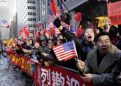 Supporters stand on Park Avenue outside the Waldorf Astoria hotel awaiting the arrival of Chinese Premier Wen Jiabao in New York, December 7, 2003. [Reuters]