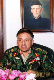 Pakistani President General Pervez Musharraf speaks to the nation in front of a portrait of Mohammad Ali Jinnah in Islamabad December 24, 2003. [Reuters]