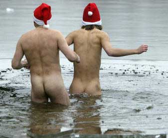 Two members of Berlin's ice swimming club 'Berliner Seehunde' (Berlin seals) take a dip in the frozen water of the Oranke lake (Orankesee) December 25, 2003. Several members of the swimming club met on Thursday for their traditional weekly ice swimming meeting. [Reuters]