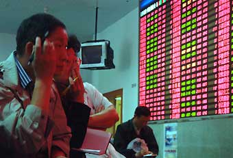 Two stockholders chat in a stock exchange in Shanghai in this undated file photo. [newsphoto.com.cn]