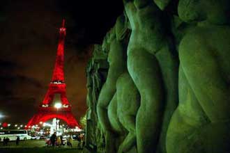 The Eiffel Tower is bathed in red light as Chinese New Year festivities kicked off in Paris, January 24, 2004. The French capital is center of the Year of China cultural exchange season, that includes Chinese art exhibitions, parades, concerts, films and circuses.  [Reuters]