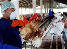 Thai farm workers collect chickens to be destroyed. Asia's bird flu crisis deepened as Indonesia said 'millions' of its chickens had died from the illness, making it the seventh nation to confirm the deadly disease. [AFP]