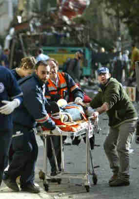 Police investigators with sniffer dogs searched the bus. Paramedics were taking away the wounded on stretchers. Others were treated at the scene. People, dazed and crying, wandered around the area. One crying woman said she had been walking down the street when she heard a loud explosion.