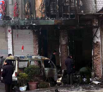 Police inspect a charred hotel building in Luoyang, Central China’s Henan Province, after a fire that killed seven people and injured 17 others, January 30, 2004. It is said that improper use of fire by a hotel staff started the fire in the Deep Forest Hotel in the early hours Friday morning. [newsphoto]