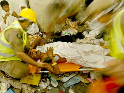 Saudi medics evacuate an injured pilgrim in the city of Mena during the third day of the Haj in Saudi Arabia, February 1, 2004. At least 50 Muslim pilgrims were trampled to death in Saudi Arabia on Sunday at the climax of the annual Haj pilgrimage, the scene of deadly stampedes in past years, witnesses said. [Reuters]
