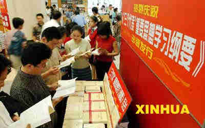 People read a newly-published book on studying the "Three Represents" Theory in Wangfujing Xinhua Bookstore in Beijing, June 11. The first batch of 250,000 copies are available in more than 100 Xinhua Bookstores in Beijing. The book, compiled by the Publicity Department of the Central Committee of the Communist Party of China, expounds the "Three Represents" thought in terms of economy, politics, culture, national defense, foreign affairs and party building. [Xinhua]