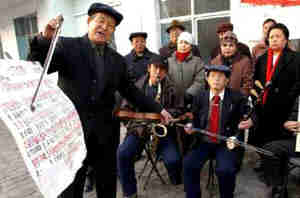 Hu Tao, a 73-year-old retired cadre, teaches local residents to sing a song on the "Three Represents" thought composed by himself on January 1, 2003 in Taiyuan, capital of north China's Shanxi Province. As a veteran literary and art worker, he often sings for residents in his community for free.