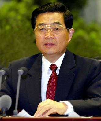 Hu Jintao, general secretary of the Central Committee of the Communist Party of China (CPC) and President of China, delivers a speech Tuesday at a symposium on the thought of "Three Represents." Hu called on the CPC and the whole nation to show greater enthusiasm for the study and implementation of the important thought. [newsphoto.com.cn]