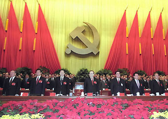 | The 16th National Congress of the Communist Party of China (CPC) closed in Beijing on November 14, with the 16th CPC Central Committee and a new Central Commission for Discipline Inspection elected and three resolutions approved. Jiang Zemin, Li Peng, Zhu Rongji, Li Ruihuan, Hu Jintao, Weijianxing and Li Lanqing stand at the conference platform. [Xinhua] |