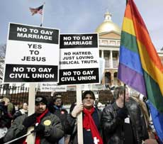 Oppenents of gay marriage protest outside the Massachusetts State House in Boston, March 11, 2004. Inside, the Massachusetts Legislature was debating an ammendment to the state's constitution banning gay marriages. In November 2003 the Massachusetts Supreme Judicial Court ruled that the state must issue marriage licenses to gay couples. [Reuters]