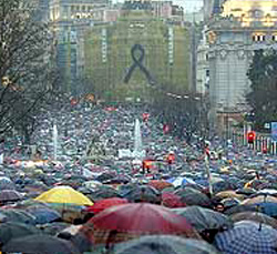 Thousands fill the central Cibeles square and the main Gran Via street in Madrid during a demonstration to protest the train bombings. [AP]