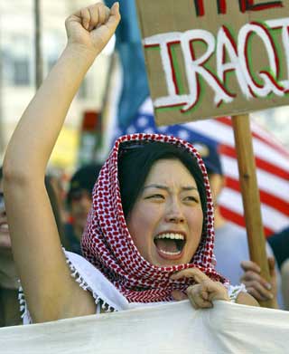 A woman protests against the war in Iraq in San Francisco, March 20, 2004.[Reuters]