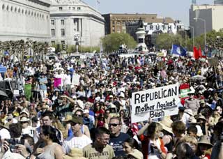 Tens of thousands of people crowd the San Francisco Civic Center Plaza after a peace march on March 20, 2004.[Reuters]