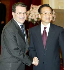 The move comes after voiced optimism over the current excellent momentum in bilateral ties between the two entities. In a significant move to enhance co-operative ties, China produced its first ever EU policy paper last October just as the European Commission adopted a new strategy on China. Both sides agreed at the 6th EU-China Summit later that month to broaden the scope of their dynamic and comprehensive partnership. According to a Chinese Foreign Ministry spokesman, Wen told Prodi the two sides should earnestly carry out their policies expressed last year, expanding and deepening their collaboration in all fields. Only last week, the European Commissioner for Research Philippe Busquin visited Beijing, enhancing EU-China co-operation in science and technology. European Commissioner for Agriculture, Rural Development and Fisheries Franz Fischler also paid a visit to China last month, exploring the potential for expanding agricultural trade. Prodi arrived in Beijing Tuesday for a four-day visit. He is scheduled to meet Chinese President Hu Jintao today before leaving for Shanghai tomorrow. His trip, the third official visit by a European Commission president, will be followed by those of another six European commissioners soon. The frequent visits indicate the great importance the EU places on its ties with China and confidence it has in China's development, Prodi was quoted as saying by the Chinese spokesman. The EU looks forward to seeing its strategic relations with China grow, Prodi said, expressing hopes the EU can become an even more important partner in trade, economics, and international affairs. Prodi also pledged the EU will adhere to its one-China policy. On May 1, the EU will undergo the largest expansion in its history, adding 10 new members to its current list of 15 countries. The EU's expansion and China's on-going efforts to build a well-off society in an all-around way have both provided new and broad space for developing co-operation, Wen told Prodi. Stressing the EU's role in regional and international affairs, Wen said that developing ties with the EU makes up an important part of China's foreign policy. The two sides should use high-level visits to continue dialogue, including the seventh summit between China and EU in December to enrich and develop their relations, said Wen. According to the Chinese spokesman, Wen also suggested the two sides should properly resolve major issues of concern via dialogue based on respect, equality and mutual benefit. Starting in 1995, China and the EU conducted years of special discussions on human rights. Advocating conversation instead of confrontation, China has repeatedly hailed the EU's participation in the talks and expressed its willingness to continue. |