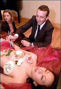 Authorities said the restaurant’s action violated the law protecting women’s rights, the law on advertising as well as the law on food sanitation. They also said the dinner was against Chinese moral standards and was humiliating for women. The health authorities banned the dinner before it was held early this month, saying that the women lacked required health certificates for restaurant employees and were improperly dressed. Some Kunming residents "were indignant, claiming it is humiliating to women," the China Daily reported at the time. "But others were curious and tempted to have a try." Red light On Body Sushi Health authorities in Southwest China's Yunnan Province has called an end to the service of the Japanese-style "feast on a beauty's body" four days after its debut.