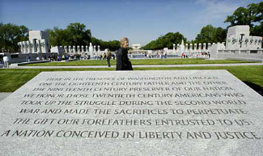 "I'm glad to be alive to see it," said 81-year-old veteran, Harold McAuliff, who suffered hearing loss after listening to Morse code on earphones during the war. He and his wife, Bette, have traveled around the world but were coming to Washington for the first time to celebrate their 58th wedding anniversary. The other many monuments in the city did not mean as much to him, he said. "I'm not associated with any of the other ones (memorials), just this," said McAuliff, who lives in Florida. Three Filipino veterans stood proudly under the pillar at the memorial engraved with "Philippines." There is a pillar for each of the 56 states and territories that existed at the time of the war and the District of Columbia. For Joaquin Tejada, 81, his visit to the memorial was a bittersweet experience. He is one of about 8,000 Filipino veterans in the United States still fighting for full benefits including disability rights, explained Eric Lachica, a Washington-based advocate working on their behalf. The monument, whose construction began in September 2001, held little historical or political significance for many of the schoolchildren visiting it in the Spring sunshine. Erika Howard, 11, on a trip from North Carolina, said she just found out her grandfather was a veteran. World War II veteran Don Hassin, 84, of Clearwater, Florida, said the monument was long overdue. "I think it's about time. We've had the Vietnamese (memorial) and all the others," he said. Behind him stood a wall of about 4,000 stars each representing 100 deaths, the total American casualties. It stood above a basin of water where people had thrown coins and a dogtag. |