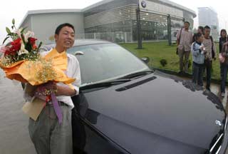 Lottery fraud victim win top prize...finally Local farmer Liu Liang finally got what he deserved on Friday -- a BMW325i car, 120,000 yuan and a sincere apology from the Shaanxi Provincial Sports Lottery Administrative Centre -- for being the victim of Shaanxi Province's sports lottery fraud. Liu, 17, had to wait 70 days for his prize, after being wrongly accused of presenting a fake ticket.