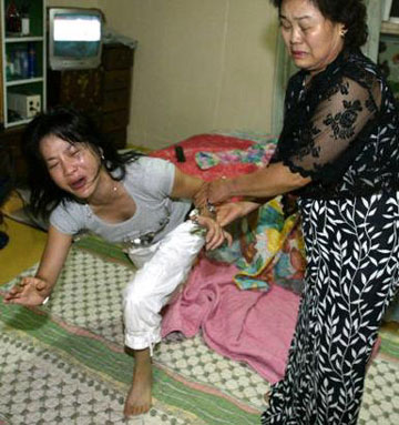 Family members of Kim Sun-il, who was kidnapped in Iraq, cry shortly after hearing that he had been killed, at their home in Busan, South Korea, June 23, 2004. Kim was killed despite government efforts for his release. The South Korean Foreign Ministry confirmed Kim's death Wednesday.  [AP]