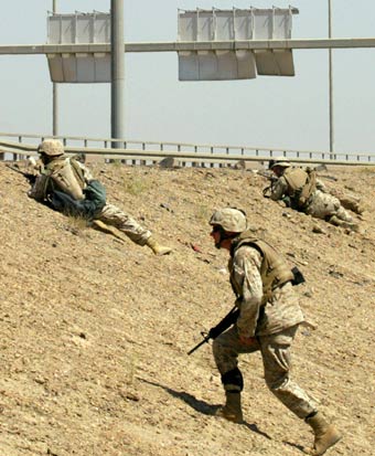 Many of the fighters wore yellow headbands bearing the name of a Muslim militant group "Saraya al-Tawhid and Jihad" (Battalions of Unification and Holy War). They handed out leaflets warning Iraqis not to "collaborate" with Americans.