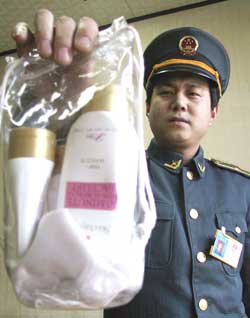 A market law enforcer shows the shoddy and poor-quality products involved the pyramid selling in Jinan, Shandong Province. [newsphoto]