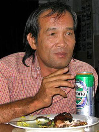 Filipino Driver Angelo de la Cruz, who had been held hostage in Iraq, enjoys a beer and a traditional Iraqi chicken dish at the Philipine embassy after he was handed over to the United Arab Emirates embassy in Baghdad, Iraq, Tuesday July 20, 2004. [AP]