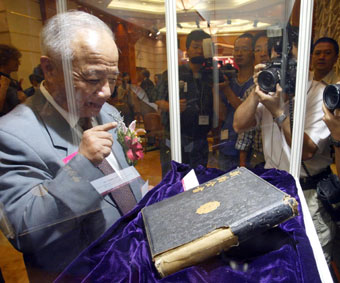 Deng Fucun, vice-chairman of the National COmmittee of the Three-Self Patriotic Movements of China, reads a copy of the New Testament published in 1894. [newsphoto]